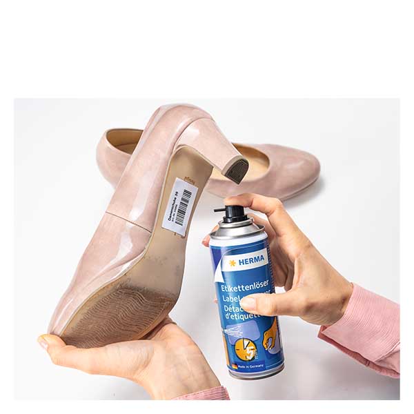 Herma Label Remover Spray Aerosol avlägsnar självhäftande etiketter av obestruket papper, t.ex. på hushållsartiklar, porslin eller kastruller, men även på många andra ytor och föremål som skor eller teknisk utrustning snabbt och enkelt. I den praktiska sprayburken är sprayen särskilt lämplig för stora etiketter eller större ytor. För att använda sprayen tar du bara av locket, applicerar på pappersetiketten med den fina sprayspetsen och fuktar väl. Etiketten kan tas bort utan problem efter bara några minuter. Torka bort eventuella limrester eller kvarvarande fukt från lösningsmedlet med en ren pappershandduk. Etikettborttagningsmedlet är tillverkat i Tyskland och är växtbaserat. Etikettborttagaren kan utan problem användas på alla icke-känsliga ytor som glas, plast eller metall. Försiktighet med känsliga och belagda ytor och material: testa på ett oansenligt område före användning.