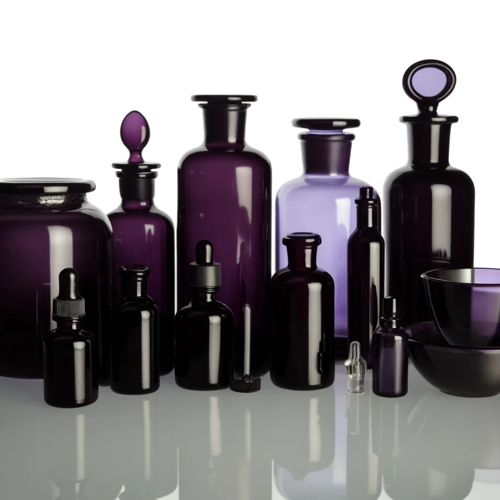 Här hittar du oljeflaskor, apoteksflaskor, droppflaskor, krukor och skålar av violettglas.