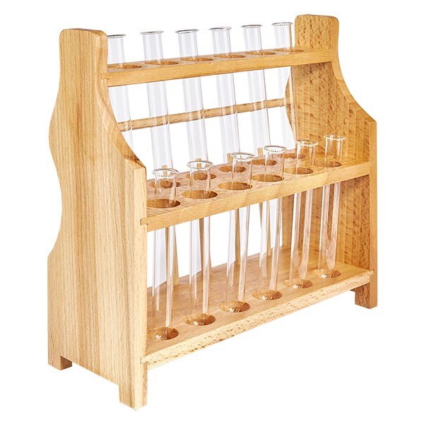 - Beskrivning: Provrörsställ av trä med 12 st provrör av borosilikat 100x12