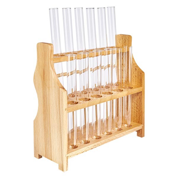 - Beskrivning: Provrörsställ av trä med 12 provrör plus sodakalk 160x16